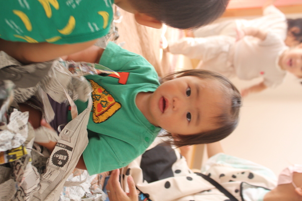 | 今日の3時のおやつは何かしら。わあ、おにぎりだー。2歳さんはラップにくるんで自分でキュッキュッと握ります。どう?自分で握ったおにぎりはおいしい? お部屋でお店屋さんが始まりました。「あのね、これとーこれとーこれください」なにを注文したのかな? 延長時間は光輝の園庭で遊びます。「おねーちゃーん」「なーに?」そんな声が聞こえてきそうね。さあいっぱい遊んだら、ママのお迎えです。大好きなママと!最後は3人で一緒に!また明日ね。「さようなら」 | ||