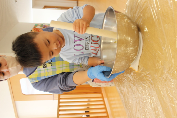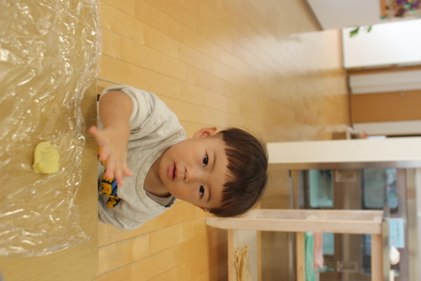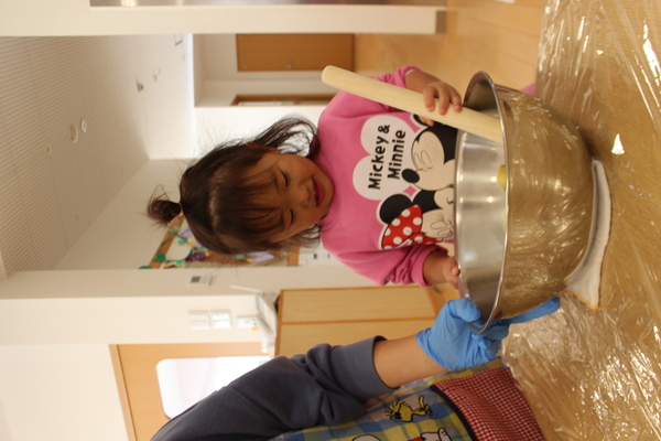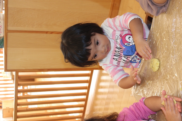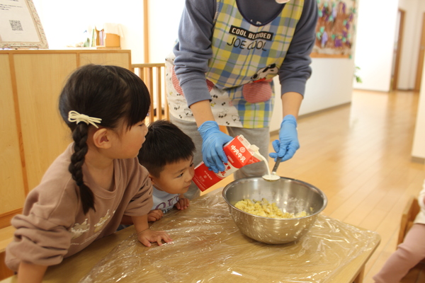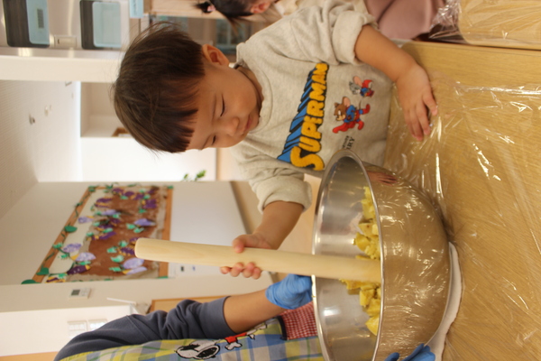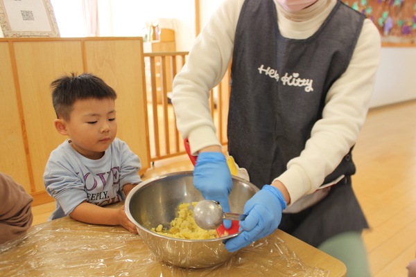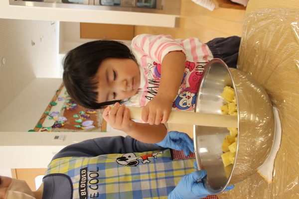 | さあ、力をこめておいもを潰します。ぎゅっぎゅ、ぎゅっぎゅっ。うまく潰れたようですよ。そこへ、お砂糖と片栗粉を加えて混ぜます。まぜまぜー「おいしくなーれ」最後に牛乳も入れますよ。だんだん柔らかくなってきました。そろそろまた、みんなの出番です。一人ずつおいもを分けてもらうと、まーるく形を作ります。上手く丸くなるかな? | ||