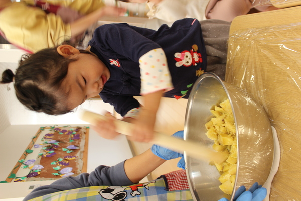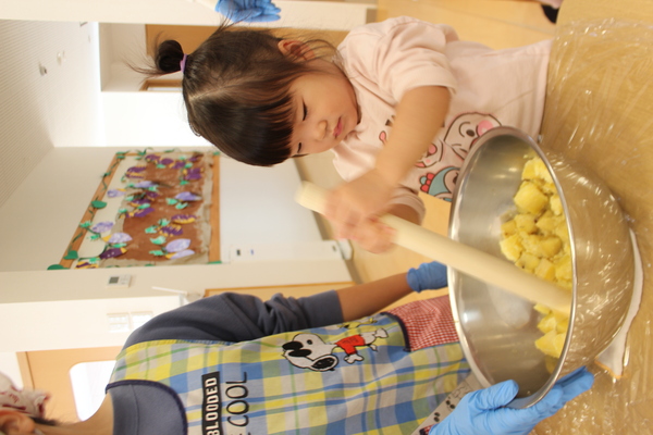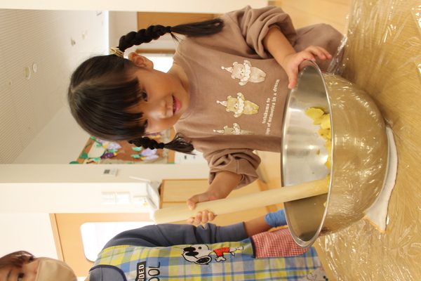 | 掘ったおいもで今日はクッキングです。担当さん何を計画してくれたかな?「今日はいももちを作りまーす」と、始まったおやつ作り。へーっ。「いももち」ですか? たしか、北海道の郷土料理だったような気がします。おいもを柔らかく湯がき(ここはレンジで時短です)ボールに入れたら、潰します。きゅっきゅっ、とんとん。交替で潰します。段々柔らかくねっとりしてきましたよ。 | ||