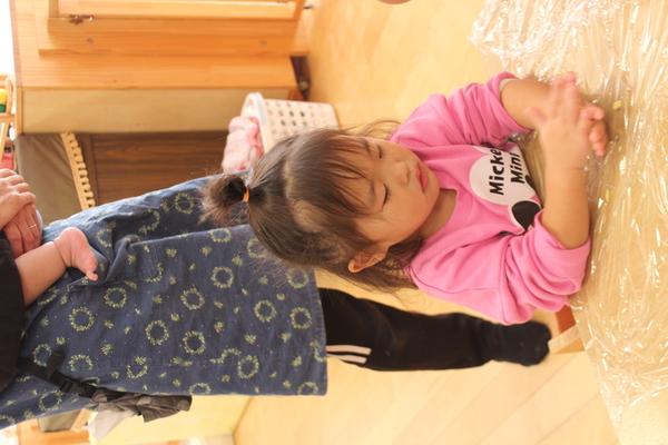 | 今日は11月生まれの子の誕生会でした。二人のおともだちがみんなにお祝いしてもらいました。3歳になったワタシと1歳になったボクです。みんなの前でちょっと、緊張したかな? 大好きなお友達にペンダントをかけてもらいました。0歳児のボクは慣れない場所でしたが、がんばりましたよ。 | ||