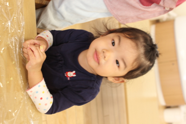 | さつまいもの「いももち」クッキング。みんなで作ると、一味も二味も違います。まあるくできたら、最後の仕上げ。フライパンにバターを敷いて、温めるといい匂いがしてきました。作った「いももち」を焼きますよ。焼けるまで、「さつまのおいも」のお話を見て待ちました。0歳児さんは、遊んで待ちます。 | ||
