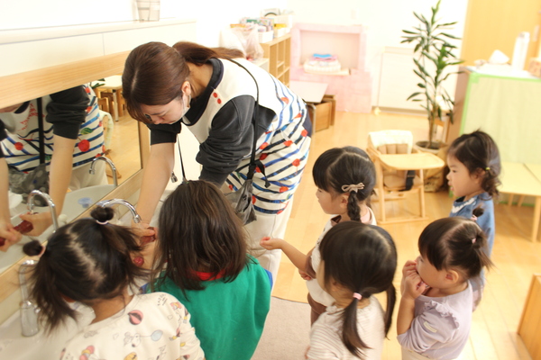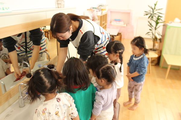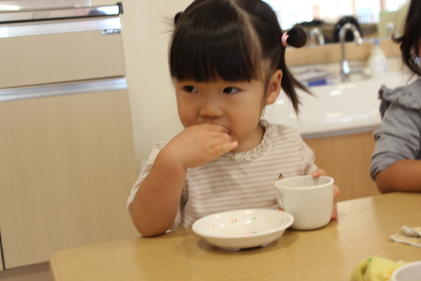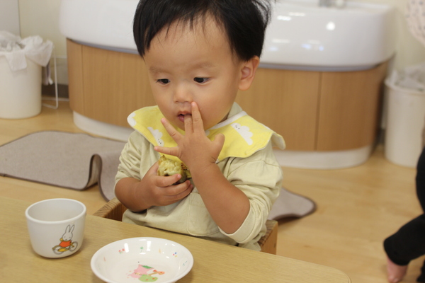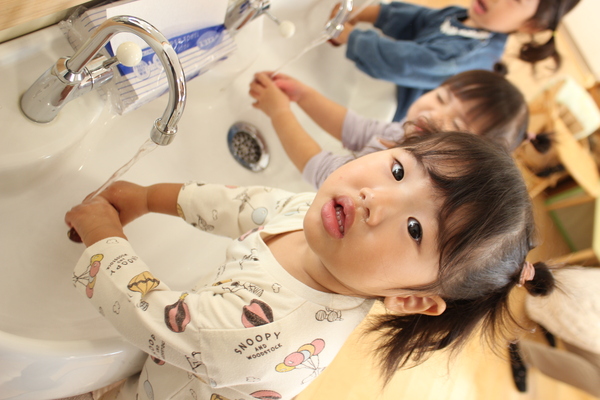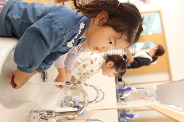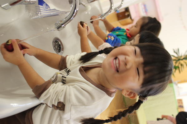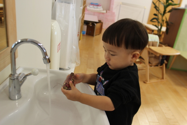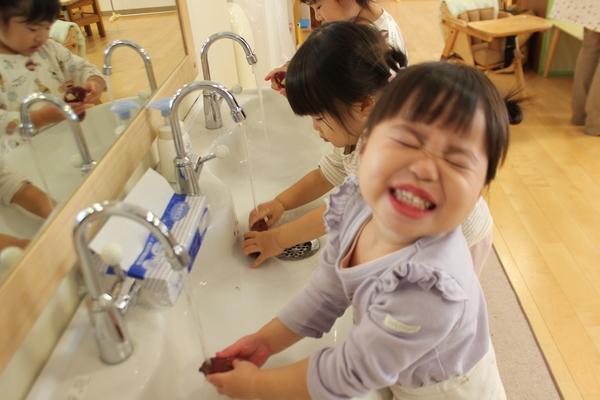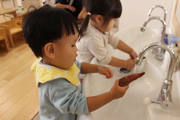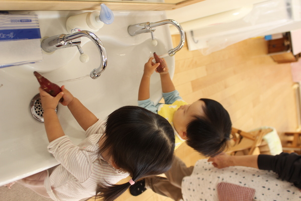 | いもほりで掘ったさつまいもがそろそろいい具合に甘みがでてくるころです。みんなでおやつに頂きましょう。段ボール箱で暫く寝ていたおいもさん。みんなでゴシゴシ洗いましょう。 | ||