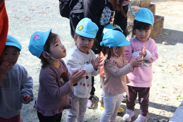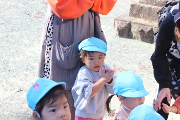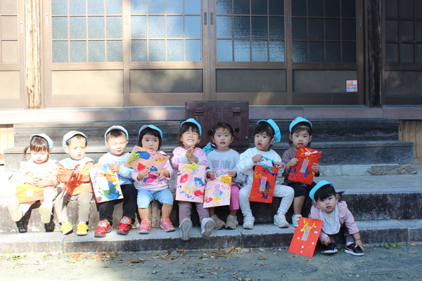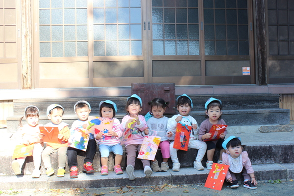 | 七五三のお祝いに、みんなで、天王社(てんのうしゃ)までお参りに行きました。みんなが、病気や、怪我をせず、元気に大きくなれますように!!七五三の袋もみんな可愛く出来上がりました。お参りした後は何かいいことあるかな? | ||