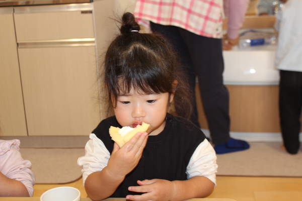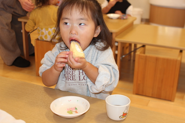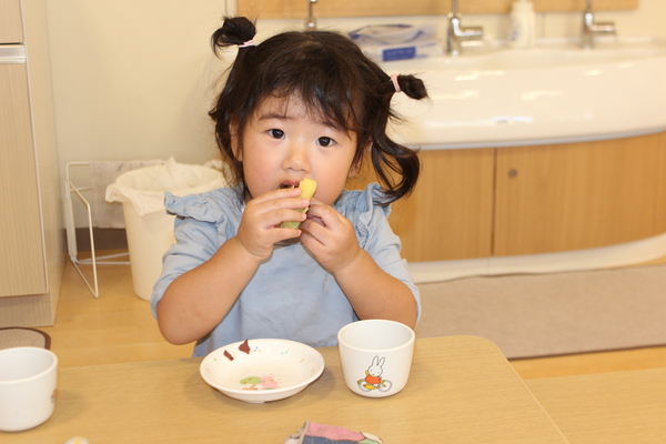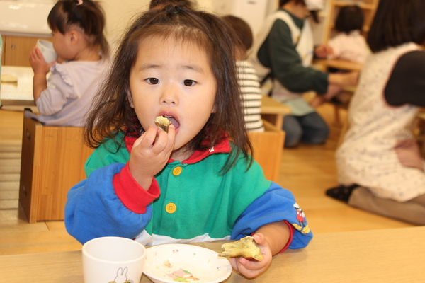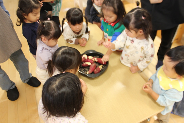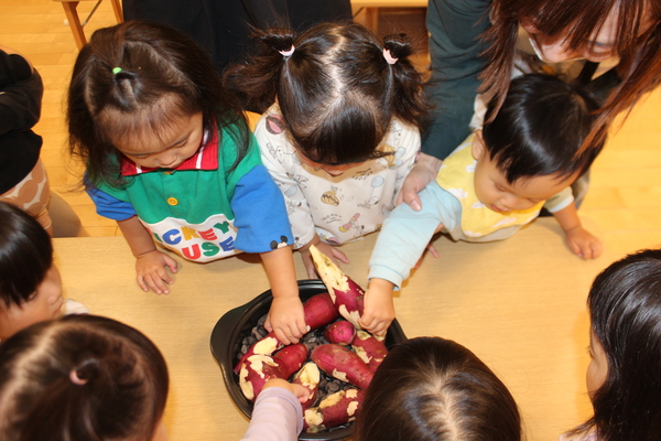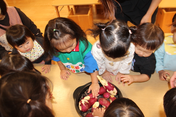 | さあ、いい匂いがしてきたよ。やったーできたよやきいも。「いただきまーす」 | ||