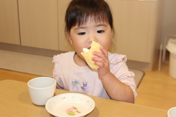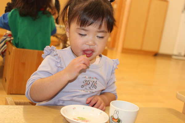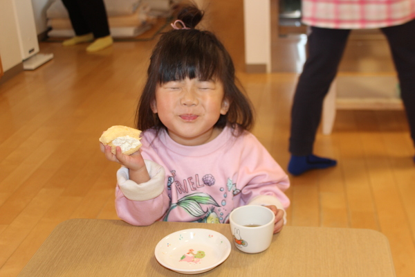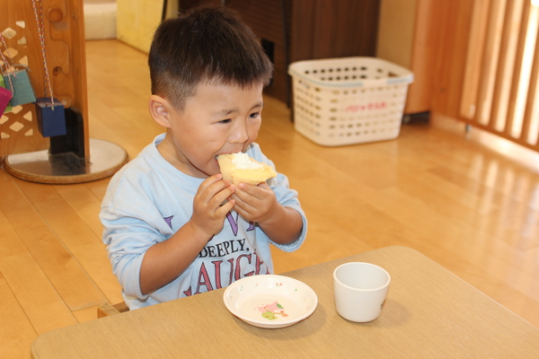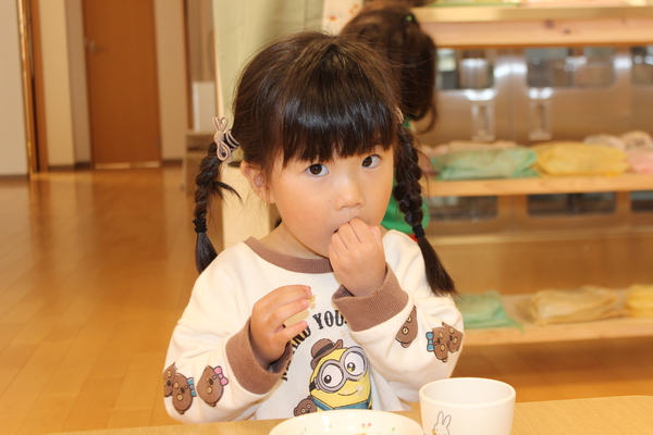 11月15日は七五三のお祝いの日ですね。キラリでは給食やおやつがお祝いメニューになりました。七五三のお祝い行事食はお赤飯、鶏のから揚げ、澄まし汁です。そして、今日はおやつにセヴィアンさんのケーキでした。みんなおいしく頂きました。 |