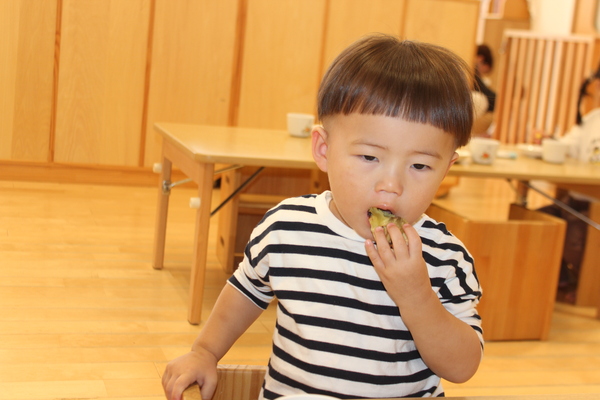 | みんなでおいもの畑にやってきました。さあ、今から、「いもほり」です。まずは、おいものつるをみんなで力を合わせて引っ張ります。「よーいしょよいしょ!うんとこしょ、どっこいしょ!」土から顔を出しているおいももいるよ。「はやくほってー」とみんなに言っているかのようです。さあ、おいもさん姿を見せてくれるかな。 | ||