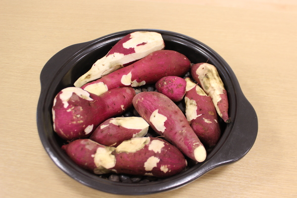 | おいもを洗ったら、お鍋の中にいれますよ。石焼いもです。まーあ。お鍋の中にいっぱい並んだわね。上手く焼けるかなー? | ||