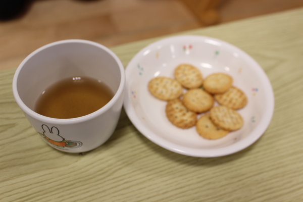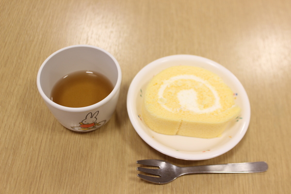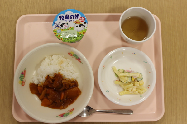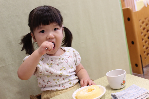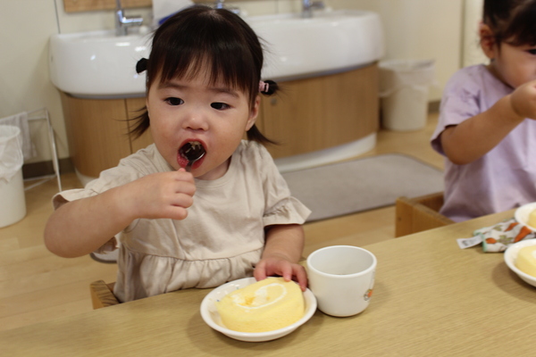 | 今日の誕生会メニューはハヤシライスと、マカロニサラダ、そして、みんな大好き牛さんのヨーグルトです。そして3時のおやつは月に一度のお楽しみ。ロールケーキですよ。0歳児のワタシはクラッカーのおやつです。もう少し大きくなったら、みんなと一緒のケーキが食べられるようになるから、それまで待っててね。 | ||